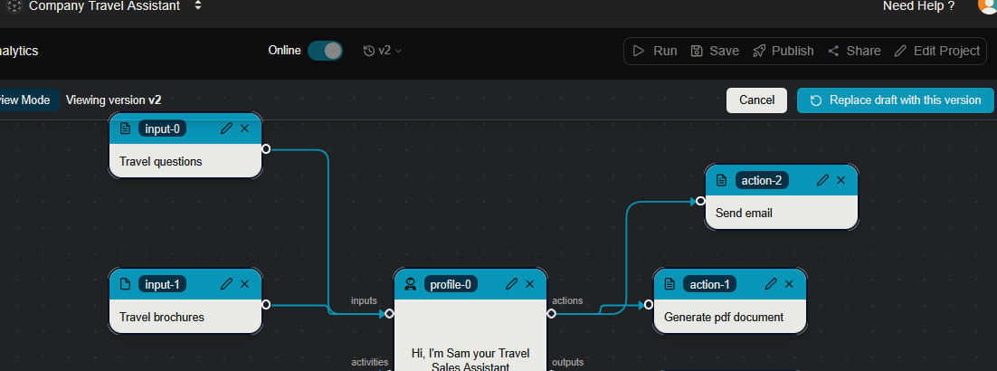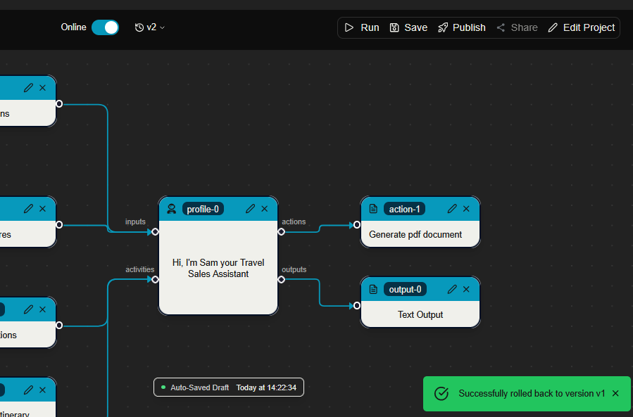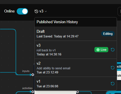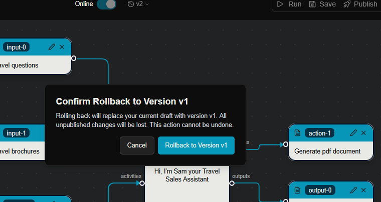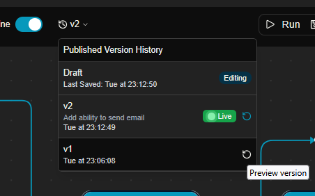 And you are able to see all of the versions of your assistants in the version section above the canvas as previously shown.