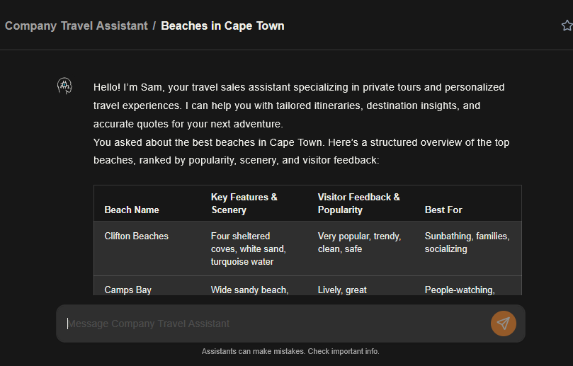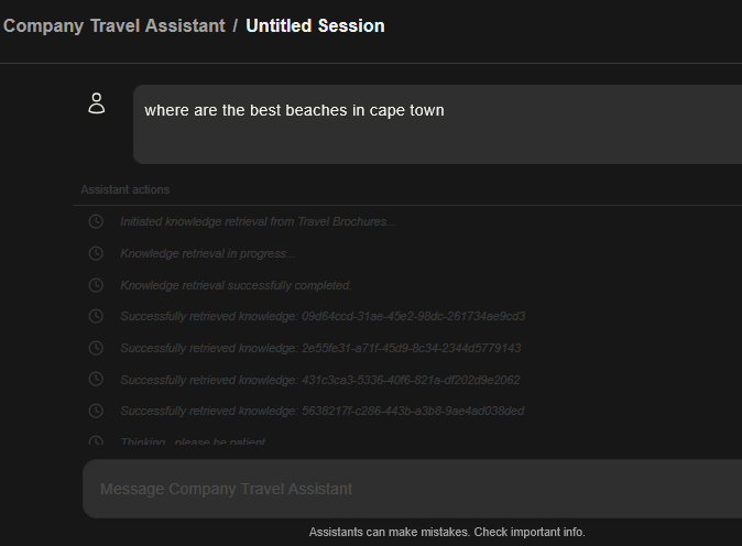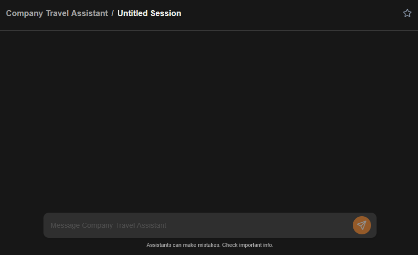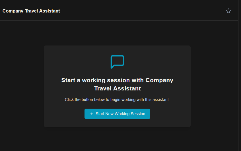First we need to start a session with the assistant. From the home tab you can click any of the assistants published by you, your team, or organisation to start a session with it